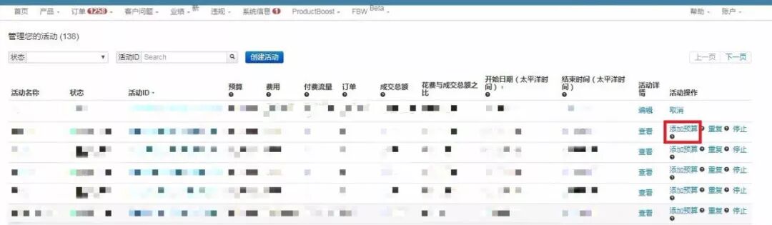 列表中详细列举了正在开展、即将开展或者已经结束的所有ProductBoost活动,找到想要增加预算的活动,点击右侧“添加预算”,即可进入预算添加页面。