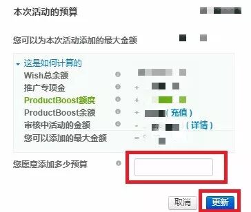 预算添加页面会向你展示,此次活动你能够添加的最大金额,所填写的添加金额不可超过该数字。如果想要增加更多预算金额,你可以给ProductBoost余额充值。