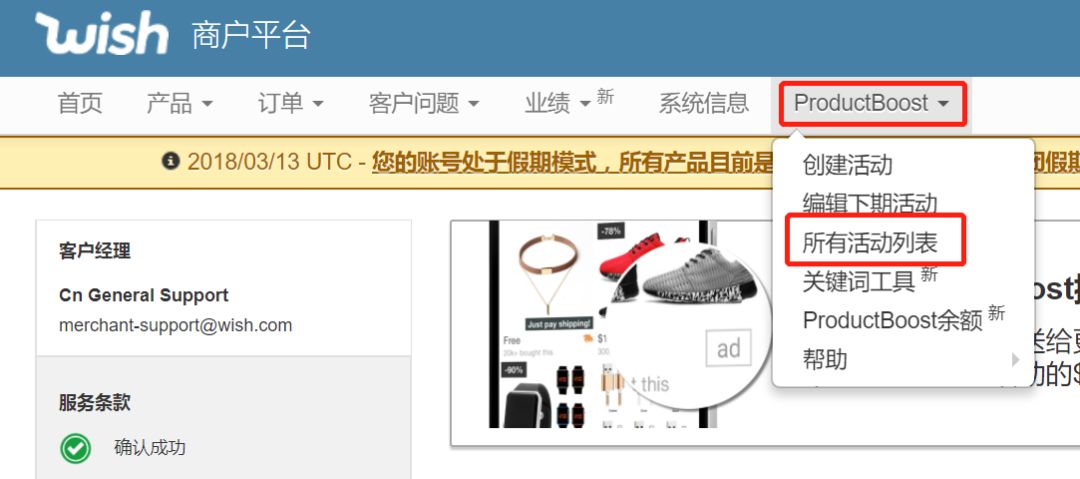 Wish商户平台首页点击“ProductBoost”>“所有活动列表”,即可进入你的PB活动列表啦~