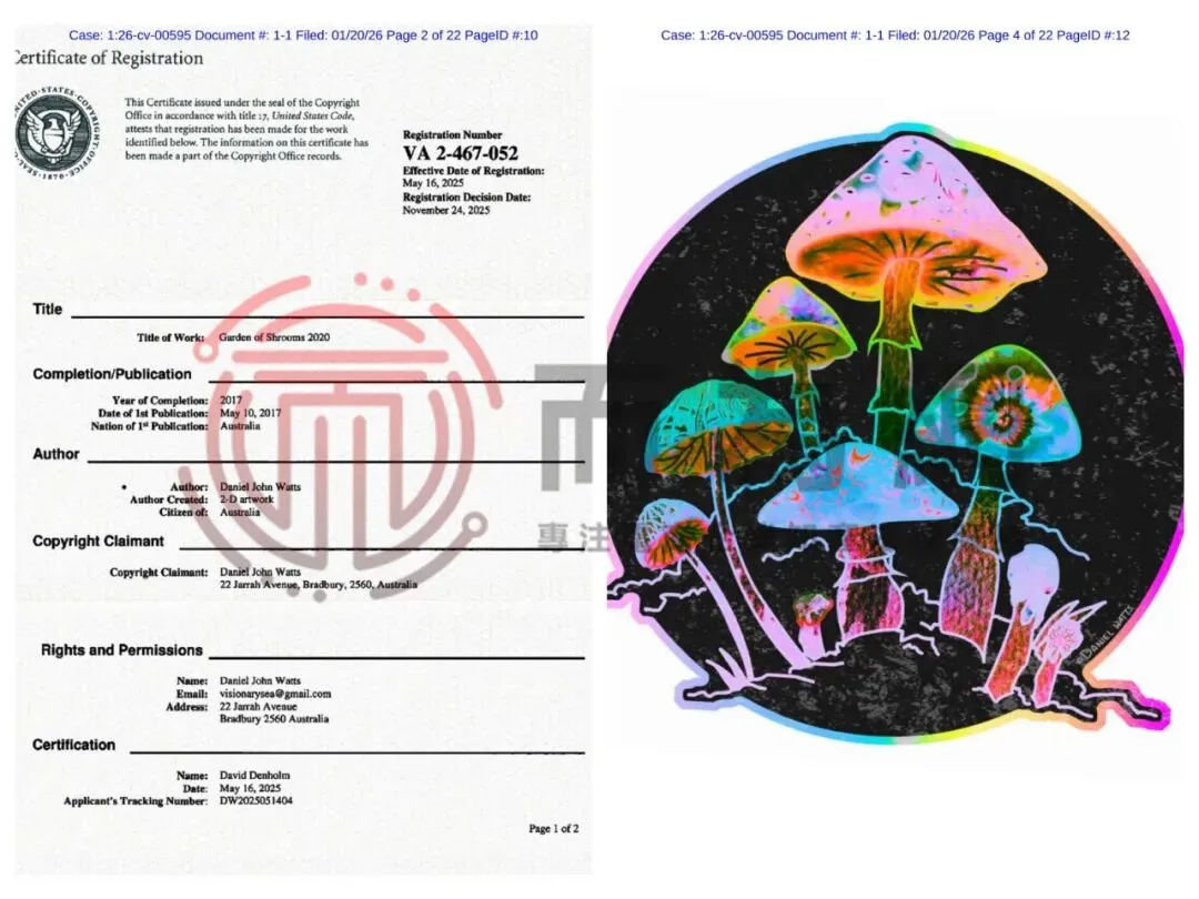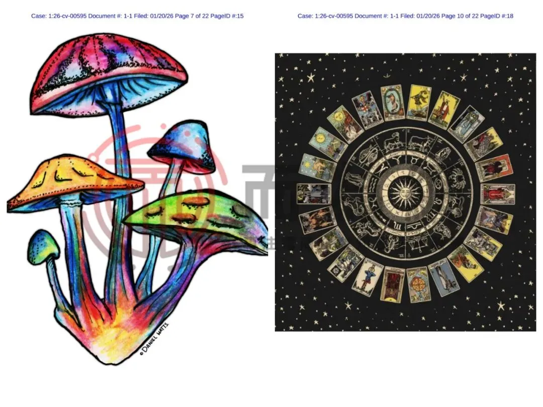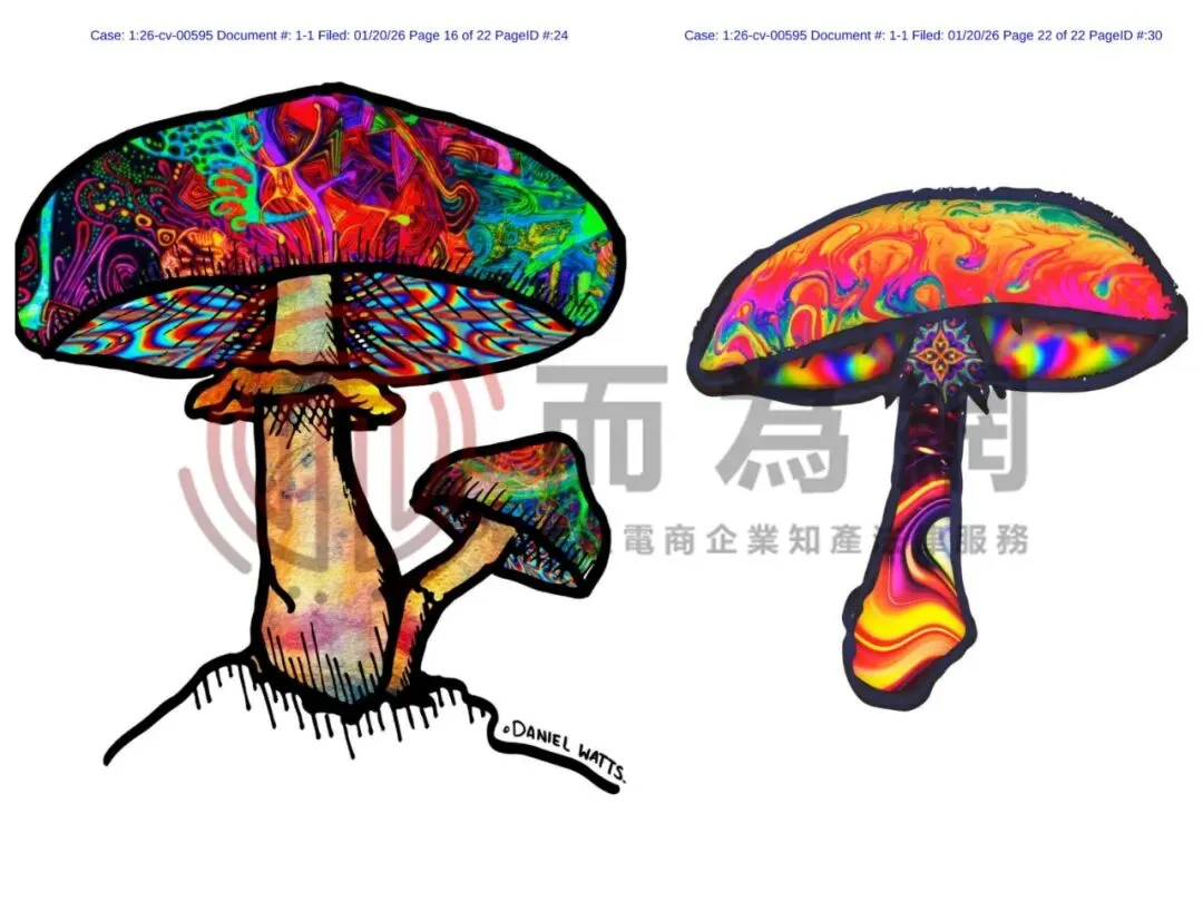 【侵权快讯】26-cv-595 Keitn代理7张全新版权发案!涉及七彩蘑菇、神秘花纹等元素!