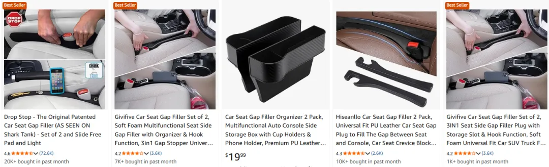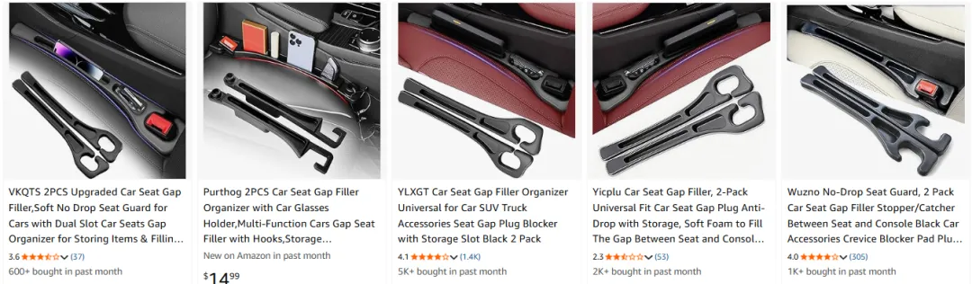 汽车座椅缝隙填充条能防止物品掉落汽车座椅缝隙分散驾驶员注意力,保障行车安全,还可阻止灰尘杂物进入,保持车内整洁,是不少消费者会选择的汽配产品。亚马逊美国站上有1000+相关listing,其中不少产品月销过年甚至破万。