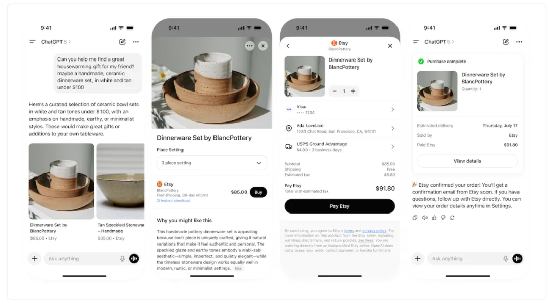 在去年的9月底,GhatGPT就正式推出“即时结账(Instant Checkout)”功能,并与Shopify、Etsy等电商巨头达成合作,用户可以在对话中直接完成从商品发现到下单购买的全过程。