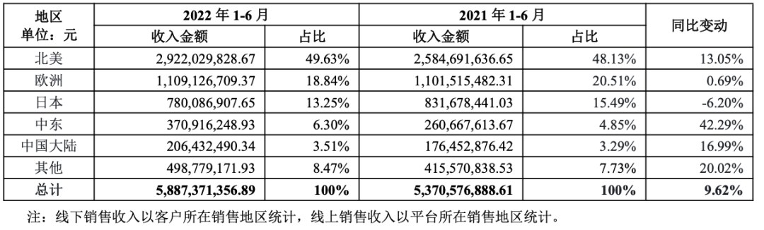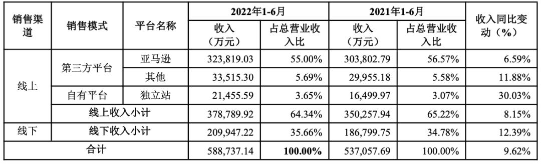 在销售渠道上,亚马逊依然是Anker的第一大收入平台,上半年收入达到32.38亿元,同比增长6.59%,营收占比55%。