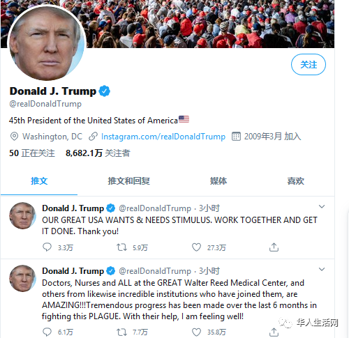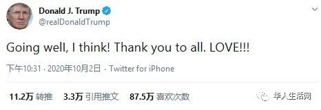 今天下午总统再次更新推特表示感谢医护人员的努力,自己状态不错。