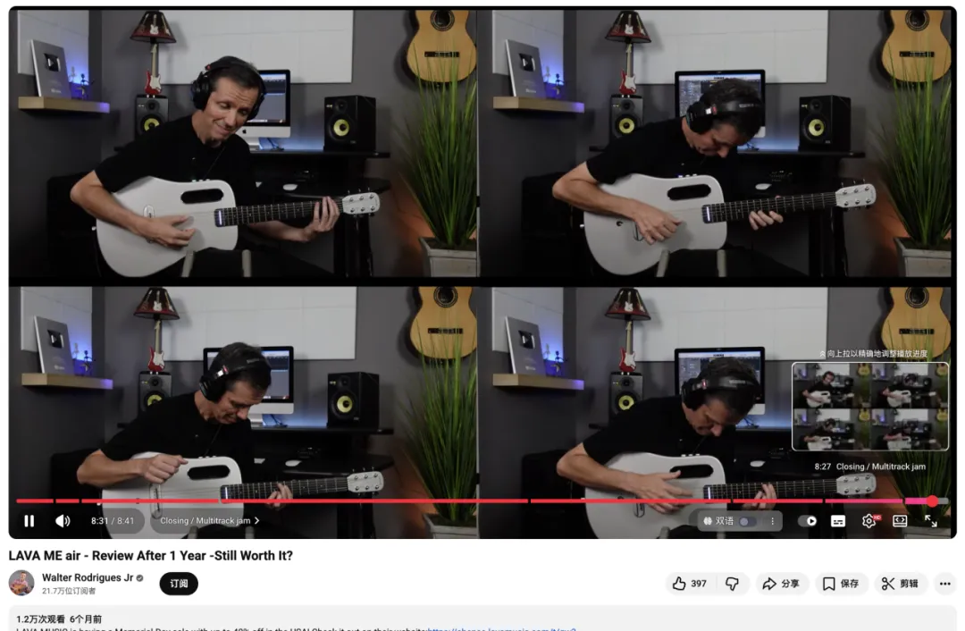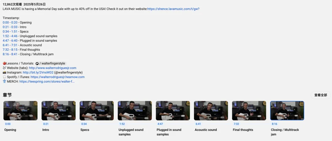 视频不是简单的产品展示,而是一套完整的评测体系:从开箱、规格介绍,到分别演示吉他在未插电与插电状态下的音色,再到细致分享手感与声学表现,最终以一段精彩的多轨即兴演奏收尾。