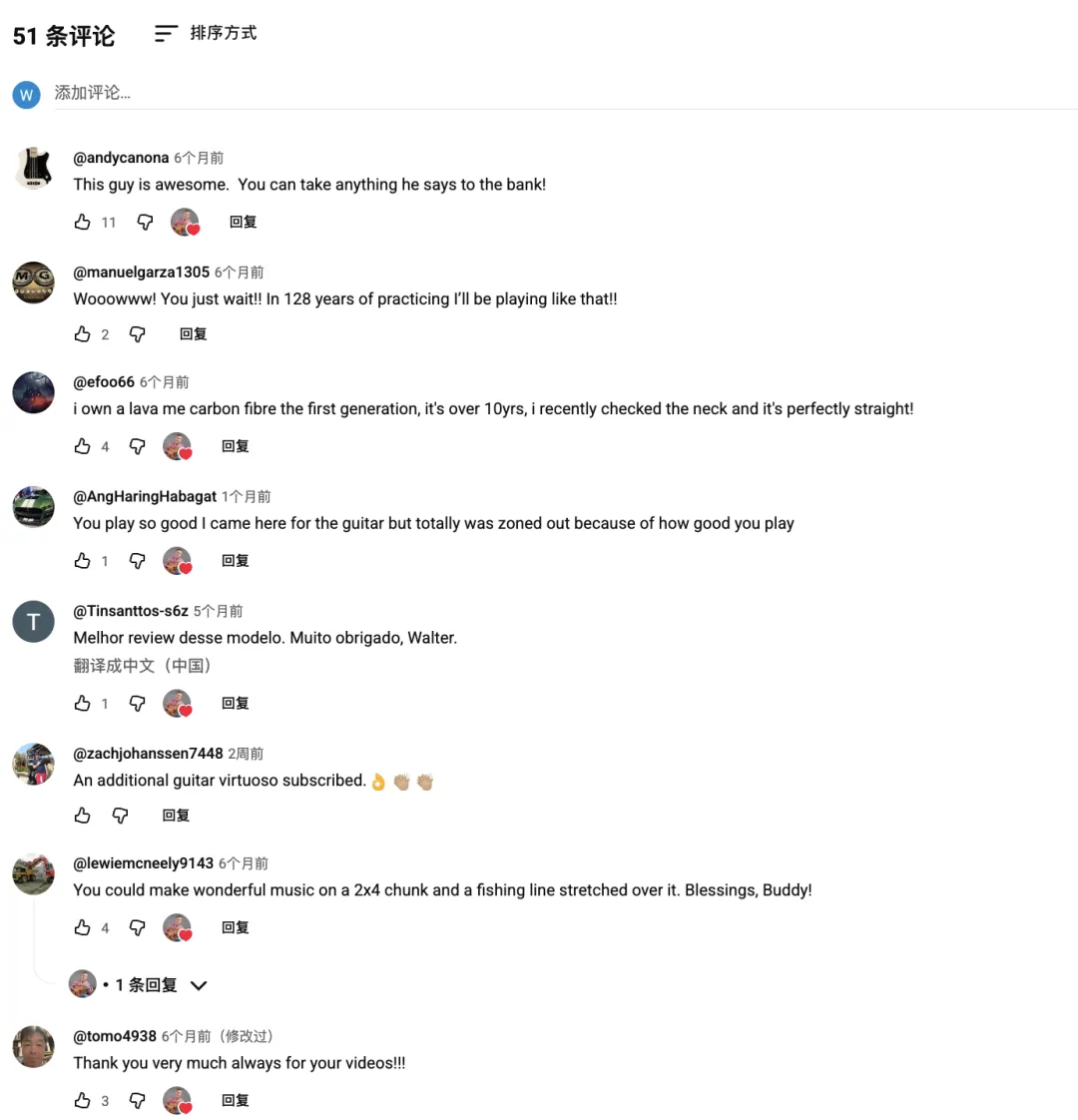 在评论区,汇集了来自英语、葡萄牙语等多语种用户的积极讨论,乐迷们不仅赞叹他的演奏,更围绕吉他本身的特性和购买细节展开交流。这正体现了垂直领域达人营销的核心价值:高效的受众过滤与高质的信任转化。