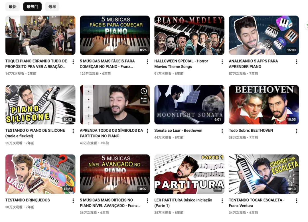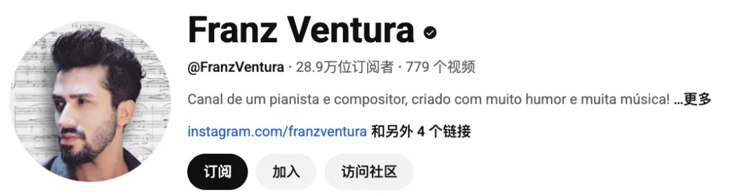 Franz Ventura是一位在YouTube上拥有28.9万订阅者的葡语音乐创作者。他以幽默亲和的风格,为葡语系国家的钢琴学习者与音乐爱好者提供教学、演奏和产品体验内容。