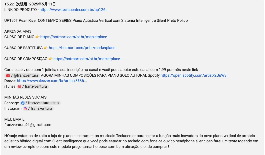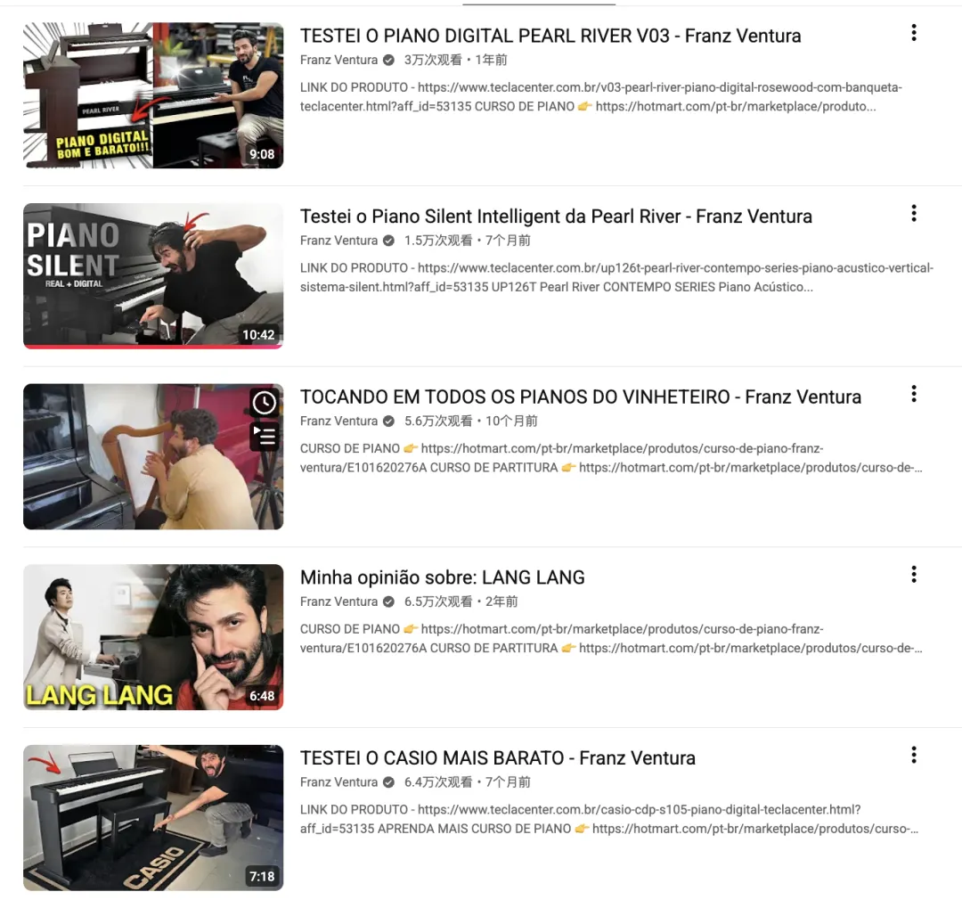 他的频道并非追求千万流量,而是构建了一个高粘性、高信任度的垂直社群。对于希望深耕巴西等葡语市场的珠江钢琴而言,他是连接本土消费者的理想桥梁。