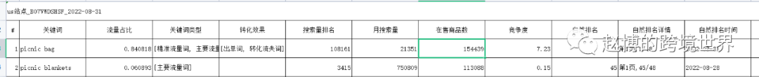 这个表格直接看到主关键词的流量占比,月搜索排名,月搜索量,在售商品数以及竞争度.