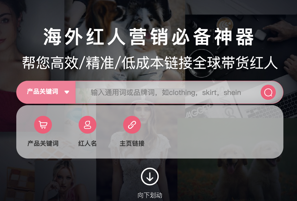 在WotoHub首页搜索框,用户可以针对三个方向进行搜索输入:产品关键词、网红名、主页链接。
