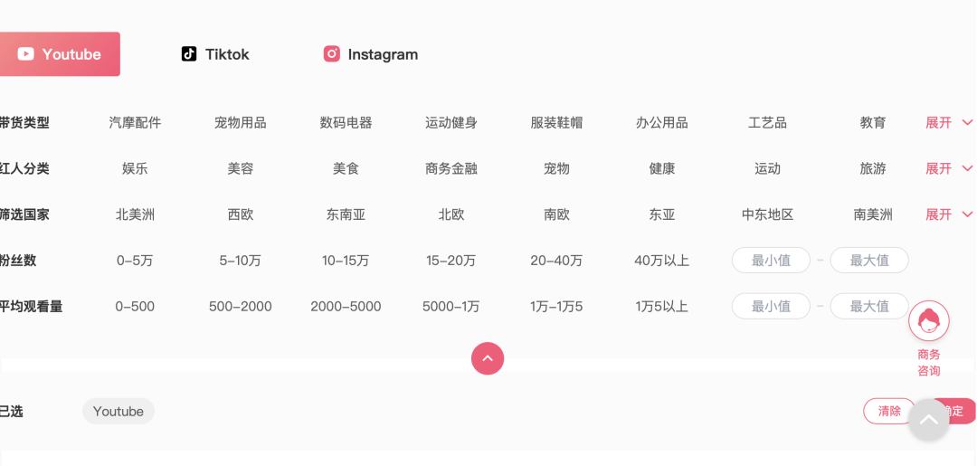 在WotoHub“网红筛选”区域,出海企业可以选择YouTube、TikTok、Instagram三个主流社媒平台;“带货类型”是从企业产品性质出发,选择自己的营销领域。