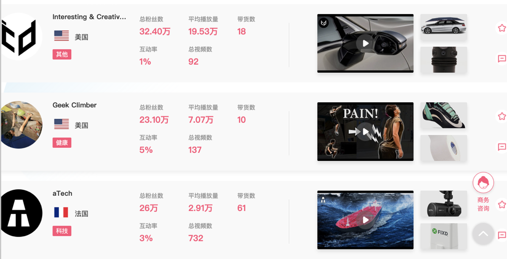 而“网红分类”就是指网红的日常内容类型,有些网红定位很清楚就做服装产品测评,而有些时尚达人也可能是科技网红,选择与品牌要求相符的网红即可。筛选国家可以从各大市场中选择品牌出海国家,再输入网红粉丝数,我们就可以高效搜索适合自己的海外网红啦!