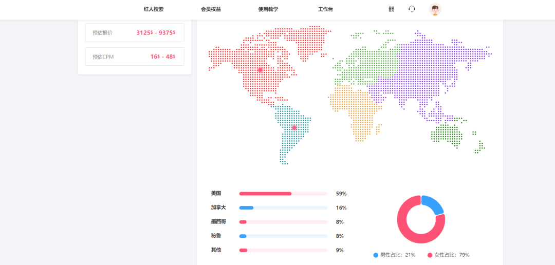 在触达走势图中,用户可以看到每天触达的海外网红数量的变化;在右侧还可以看到企业目前触达网红的国家数据分析。在面板下方,系统为大家实时推荐的海外网红呈现于此。