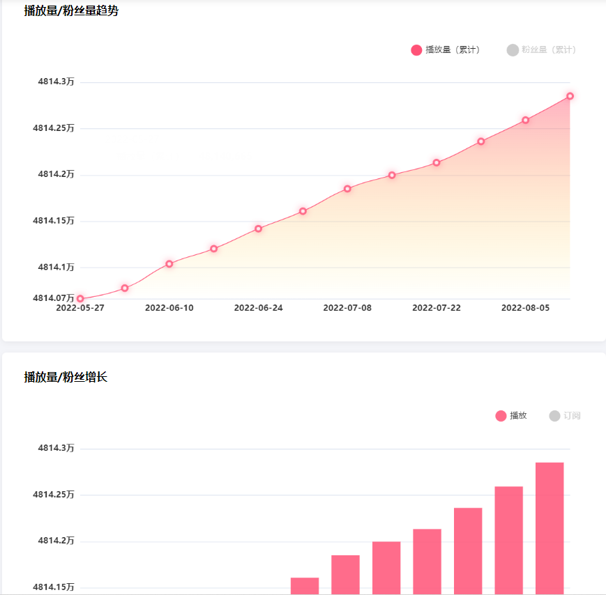 受众分析可以看到网红粉丝的国家地区和男女比例,出海企业可以以此来评估频道粉丝与自己产品受众是否匹配。另外我们还可以在网红详情页看到网红的播放量和粉丝量趋势分析: