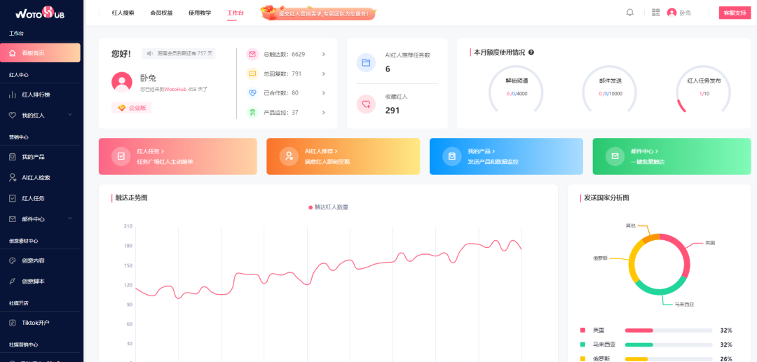 在工作台中,用户可以进行海外网红营销各工作流程的管理操作。在工作台看板首页,我们可以看到醒目的四个色块,方便大家管理四大WotoHub常用功能:网红任务、AI网红推荐、我的产品、邮件中心。