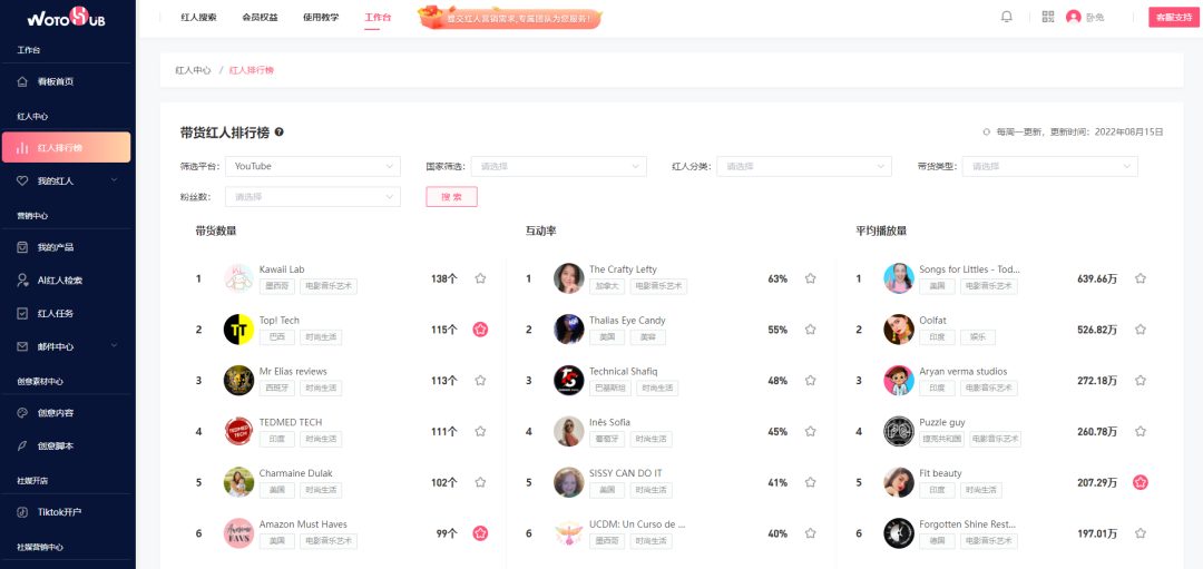 WotoHub有三大带货网红排行:带货数量、互动率、视频平均播放量,三大榜单各评选100位海外网红,每周更新一次。