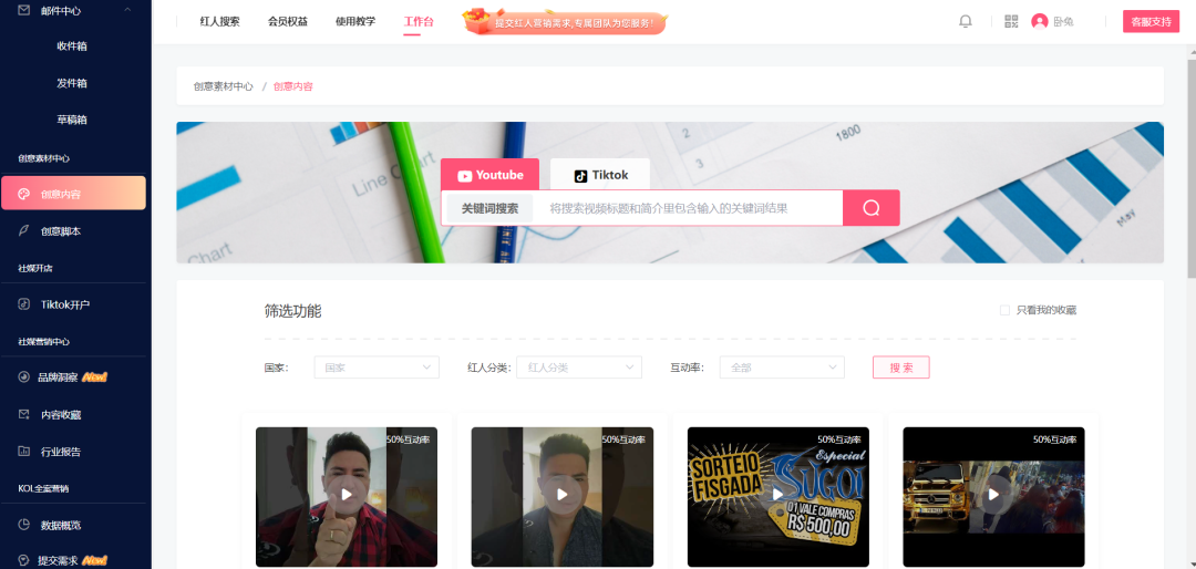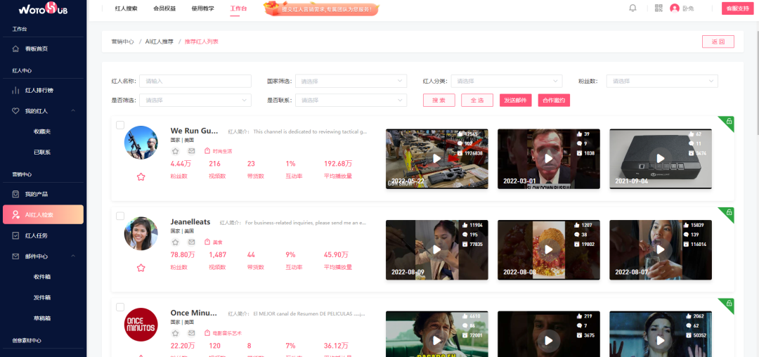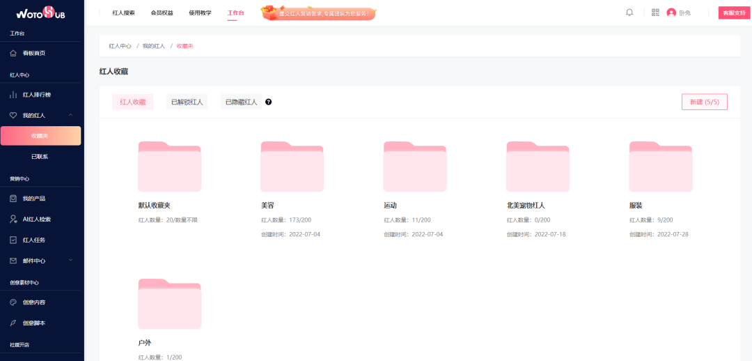 整个工作台菜单分为六个板块:“网红中心”、“营销中心”、“创意素材中心”、“社媒开店”、“社媒营销中心”、“KOL全案营销”。在这里,我们先详细了解使用WotoHub海外网红智能营销云平台进行自主网红开发与维护的基础功能。