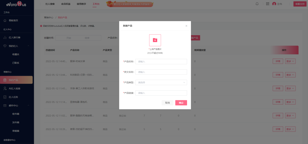 “营销中心”是WotoHub的常用工作板块,功能就是看板页面中的4个色块功能:我的产品、AI网红推荐、网红任务、邮件中心。