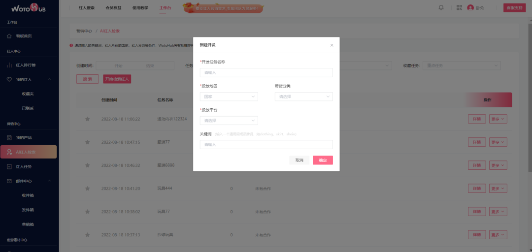 进入工作台“AI网红检索”页面,我们需要先创建开发任务,比如给面包机寻找适合的海外网红: