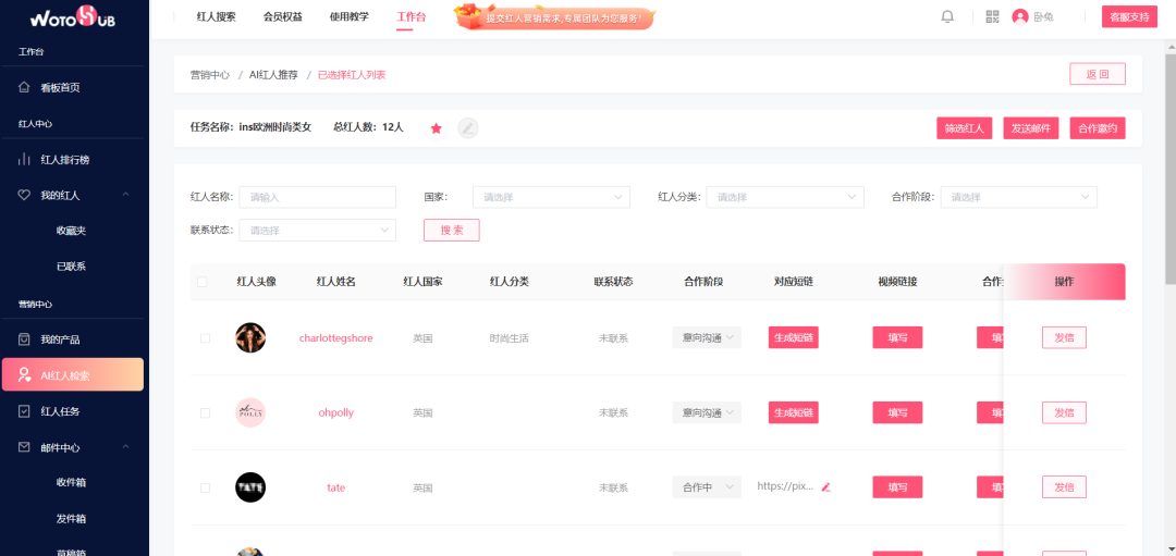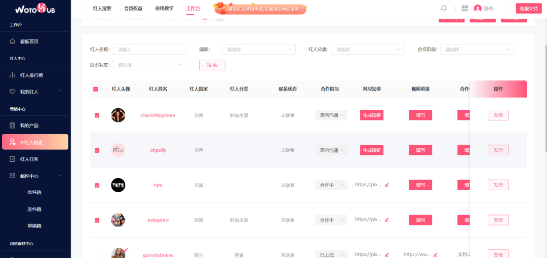 此时,我们可以进行更多网红管理操作:发信、产品短链、视频链接、合作费用,查看网红联系状态、合作阶段,点击网红进入网红详情。如果想筛选更多网红,只需要点击筛选网红,再次进入网红检索页面。