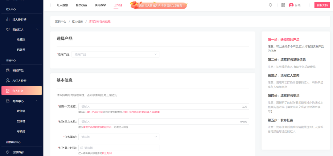 “网红任务”指的是“品牌创建任务,网红自主接单”,在这里品牌可以掌握更多海外网红营销主动权:编辑好合作条件,等待网红联系自己。