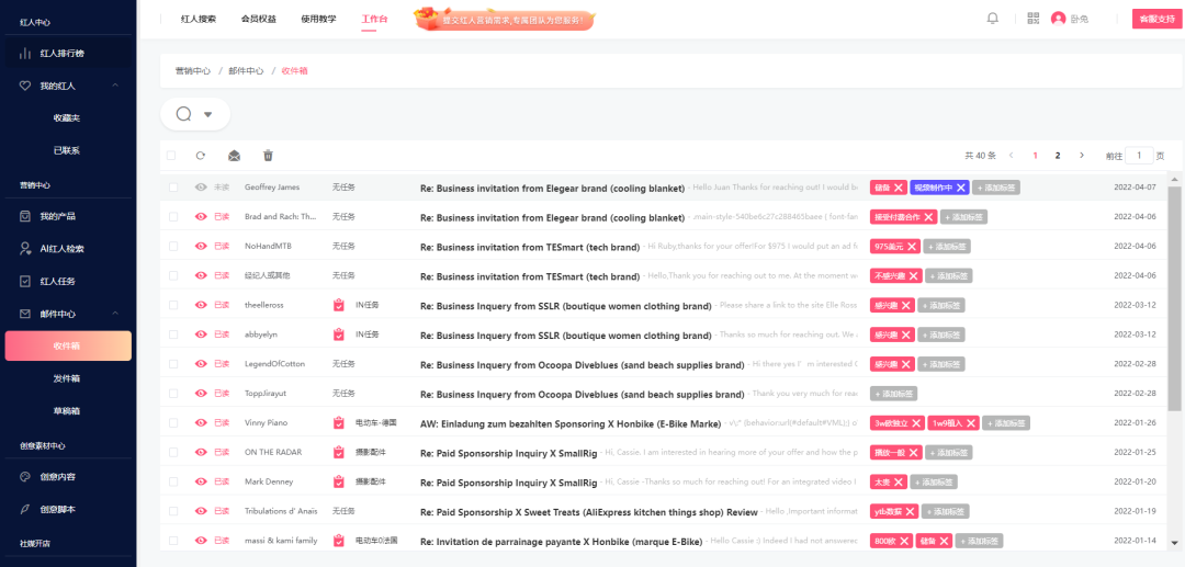 在收件箱,我们还可以编辑网红标签,阅读网红回复内容后,将需要特别标记的信息直接编辑标签化提醒,比如费用、比如候选,比如类别。
