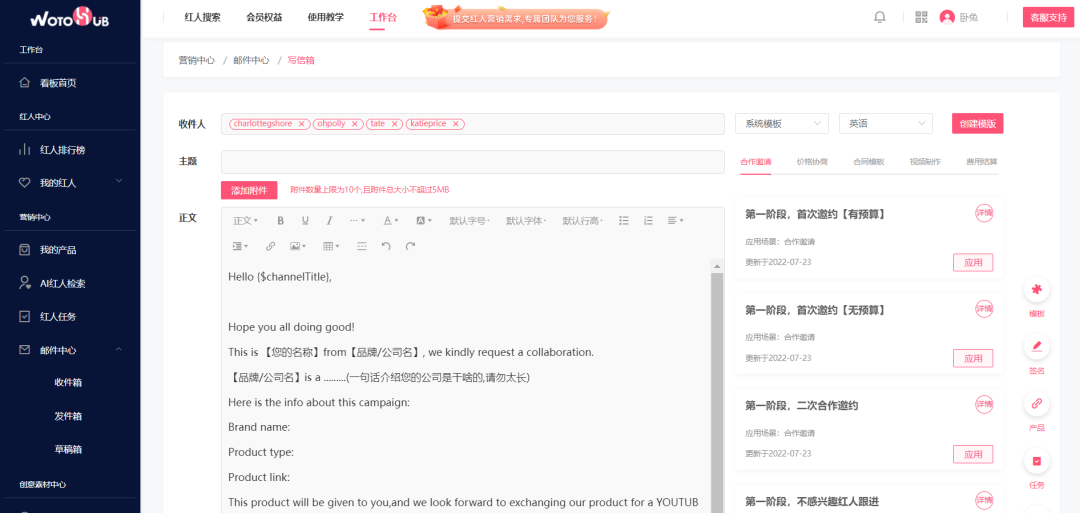 在邮件发送过程中,我们能够选择多语言邮件模板,使用信息内容完成给网红的邮件编辑填写,还可以在邮件中添加产品链接,以及合作大致要求。