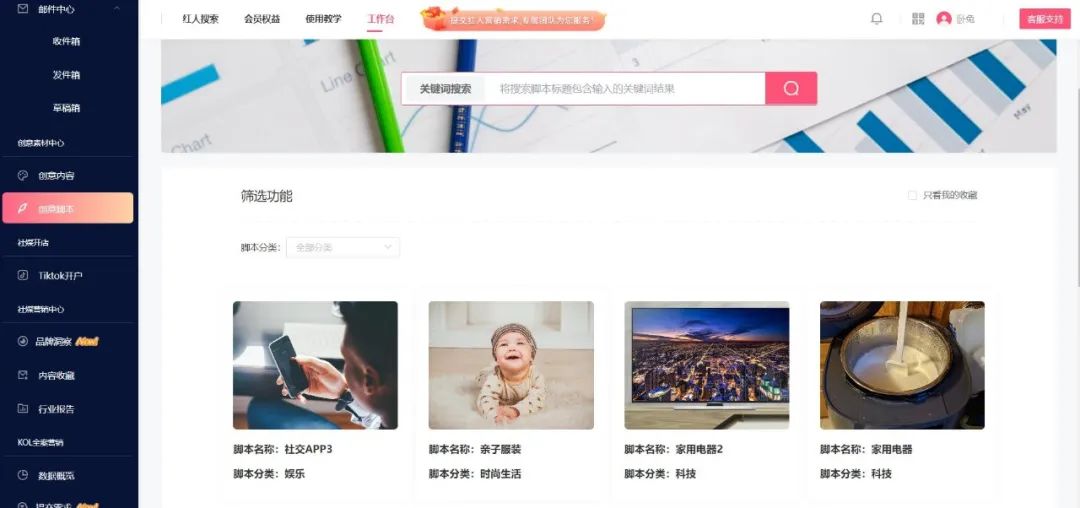 “创意素材中心”分为创意内容、创意脚本两个板块。