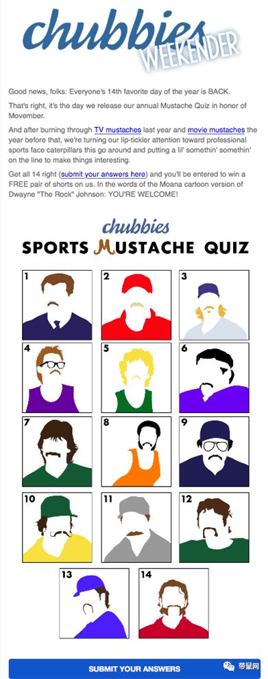 卖家还可以围绕主题创建内容,例如发布带有小胡子标识的照片、视频或图文,或发送有关活动主题的电子邮件、有趣的奇闻和关于小胡子的笑话。商家还可以创建有关于胡子的互动游戏。