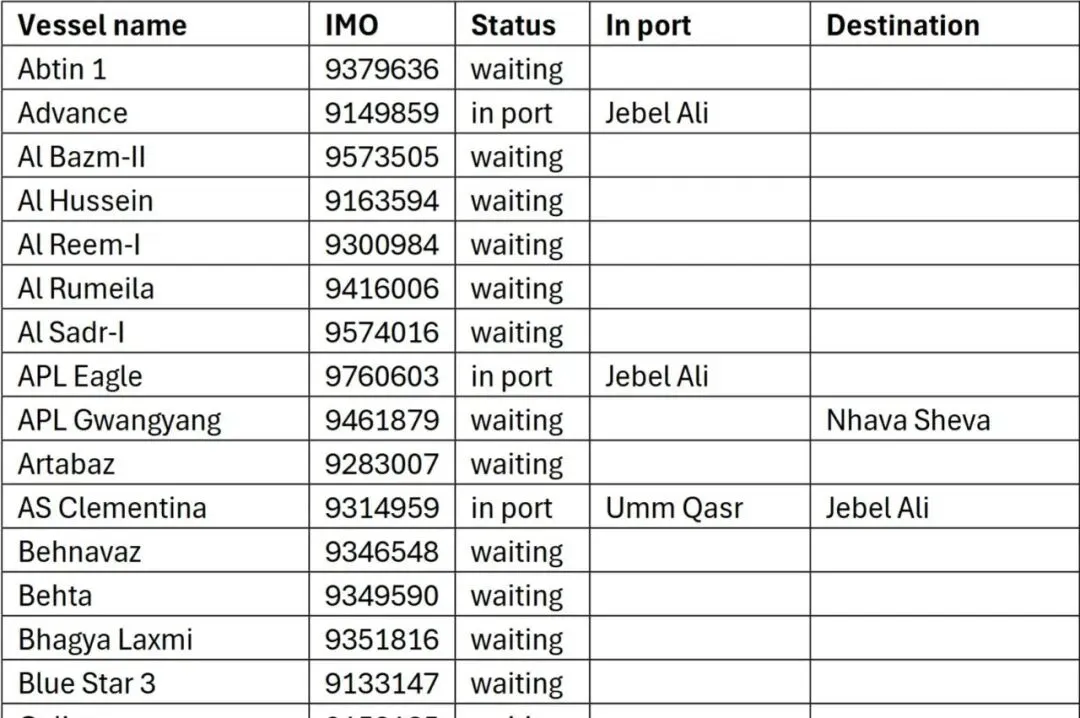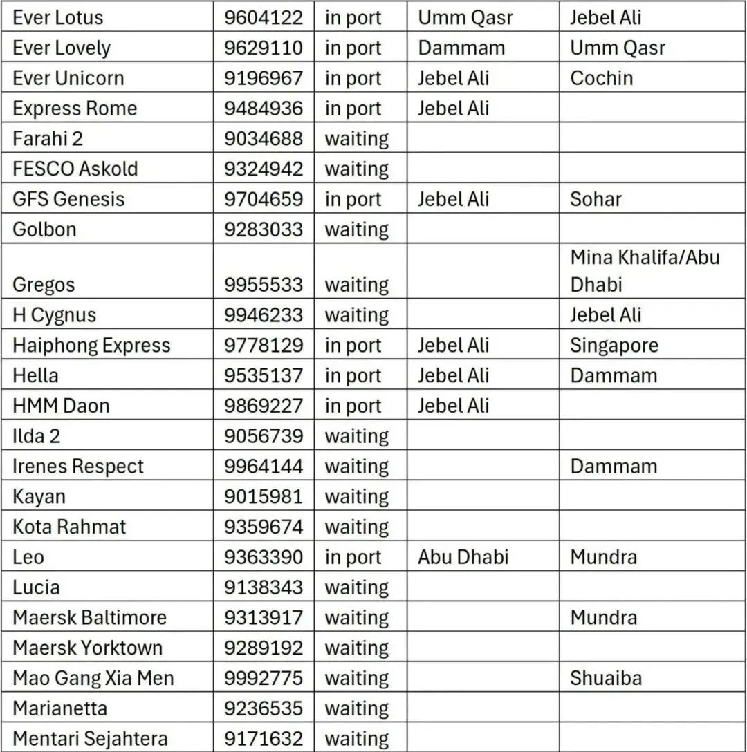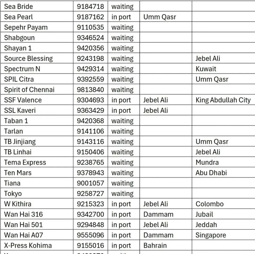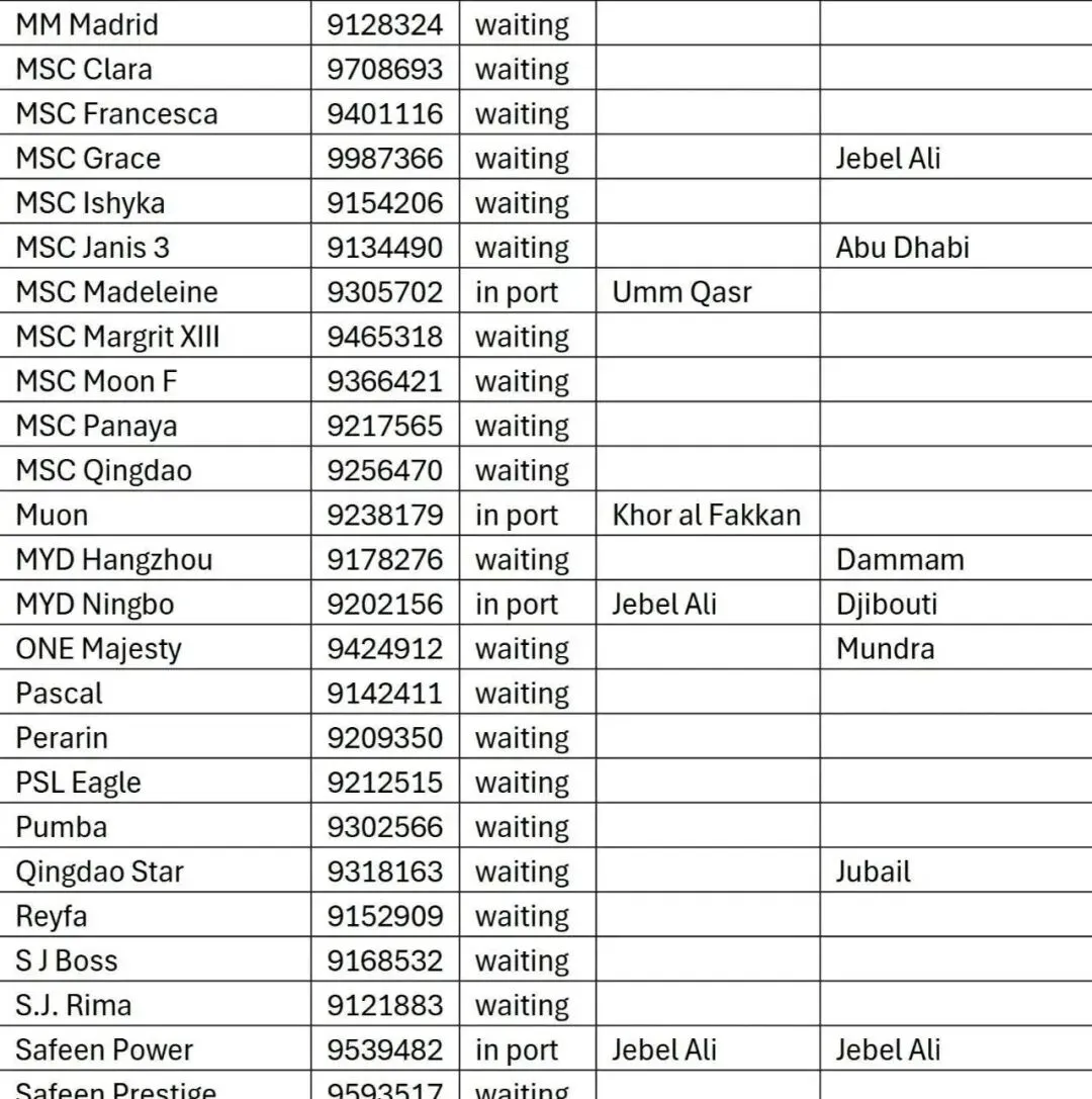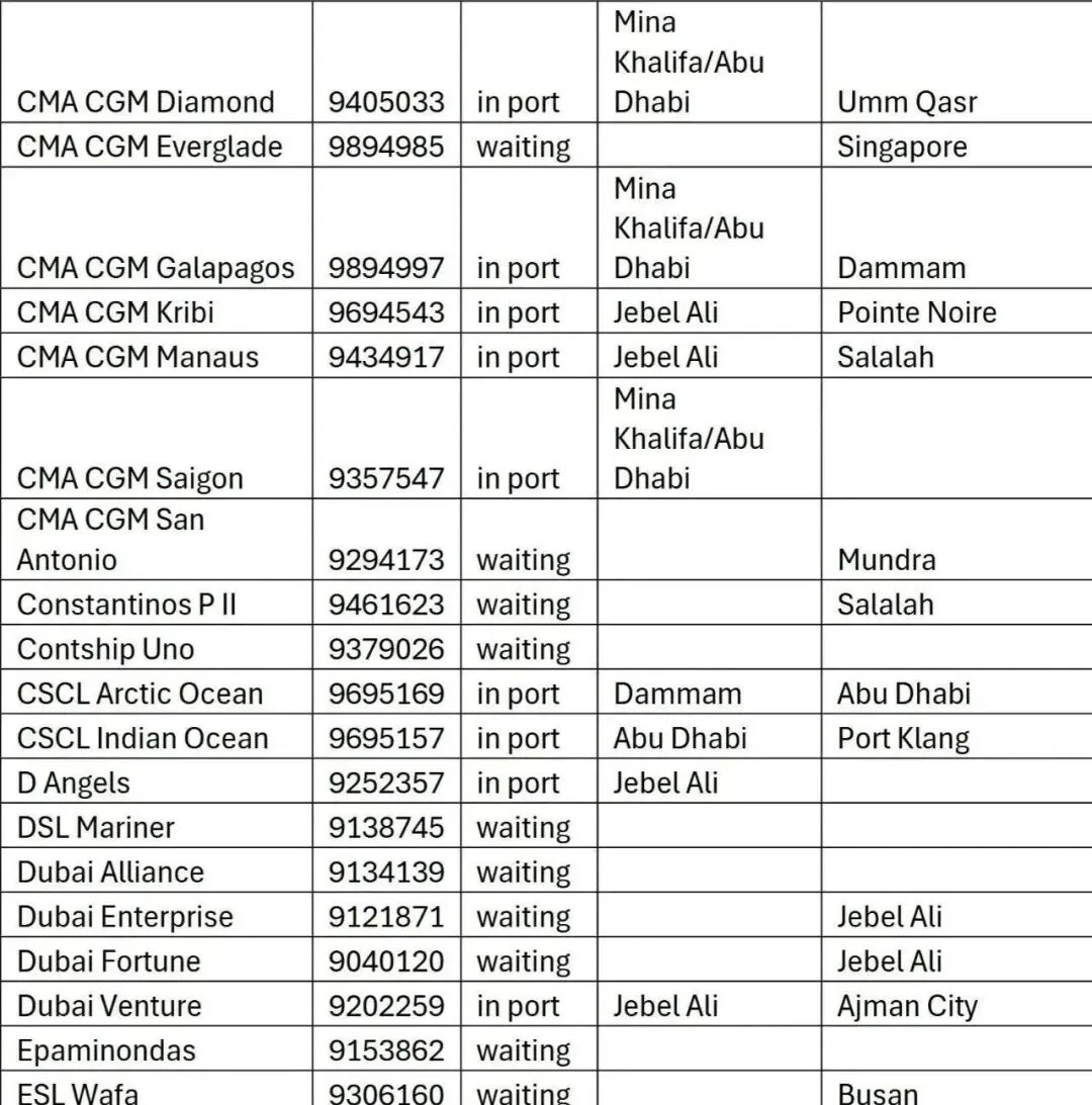 以下为部分滞留在波斯湾内的集装箱船详情,包含船名、IMO 编号、当前状态、停靠港口及下一目的港等信息。