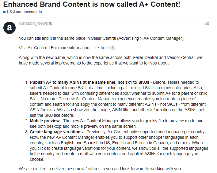 转眼间 7天愉快的小长假结束了, 作为亚马逊卖家中的一员, 这个假期, 你是坚守在岗位为业绩而拼搏, 还是放假在家不分白昼的睡觉补眠; 亦或是彻底放松到底线, 无节制的胡吃海喝,疯狂玩乐? 步入10月份, Q4旺季又离我们近了一步,大家在备战旺季的同时,还需要留意亚马逊的一些政策调整和新变化。接下来,船长将为大家梳理近期及10月开始,亚马逊的一些新动作。 近期新动作 1、亚马逊推出新留评方式 ——One-tap Ratings(一键评分) 船长获悉,上个月亚马逊开始测试一项新的留评功能,该功能将实现“一键评分”操作,买家只需要进入留评页面,选择好星级评,提交即可留下产品反馈。 据了解,亚马逊测试该功能的主要目的是为了鼓励那些没有时间、精力或兴趣撰写评论的买家,也能够分享他们对产品的看法。同时,帮助买家从更广泛的消费者群体中获得真实的客户对产品的评价 此外,船长注意到,在listing的最底部,评论下方,你会看到有关“reviews(评论)”与 “ratings (评级)”的通知: (图源亚马逊) 在“Customer reviews(客户评论)”页面上,你会看到以下内容: (图源亚马逊) 值得注意的是,所有这些“ratings”可能只由一个品牌给予五星级“ratings”的客户在同一天留下,你绝对无法知道这些关键信息。显示的只是“ratings”的数量。这对于卖家而言,不管是排名还是整体的评级,都可能带来很大的影响,比如遭受负面评论攻击的卖家将几乎没有办法对抗这些有害的评论。 具体详情点击:卖家获评新方式!亚马逊将推One-tap Ratings一键评分功能 2、亚马逊推出新广告活动 ——Sponsored Display(展示型广告) 关于SD广告,船长BI在之前就已经介绍过,简单的说就是展示型广告。卖家可以将产品根据用户行为所描绘的用户肖像更精确的投放到每一个广告受众上。可以面向站外投放,和国内的京东、淘宝的站外广告类似,让买家在外部网站或APP上也能看到卖家投放的广告。 (点击查看大图) 船长BI除了提供和亚马逊后台一样的所有操作,也提供了可视化的报表数据分析,更方便卖家直接管理和分析SD广告。 具体详情点击:利好!亚马逊推Sponsored Display新广告助力卖家销售 3、亚马逊FBA新规定 ——重新包装服务或无法禁用 有卖家发现,通过亚马逊卖家中心进入FBA服务时,FBA重新包装服务消失了,无法“禁用”。而在“Learn more(了解更多)”的帮助页面,重新包装是自动、合规的项目,变成强制性选项,而出现一个可选的翻新服务,这或多或少会给FBA卖家运营带来一定的影响。 4、亚马逊澳大利亚站推出新计划 ——Renewed(更新) 据悉,该计划可为客户提供购买经认证的翻新产品的选择,并保证获得由销售伙伴提供的六个月保修。 参与该计划的卖家的产品将在亚马逊澳大利亚网站中会被标记为“Renewed”。 5、亚马逊更新了自动定价政策 ——特定情况下可提高价格 现在,拥有专业账户的卖家可以通过自动定价来提高产品的价格。方法是在创建重新定价规则的同时选择”Compare off Amazon(对比亚马逊以外的价格)”选项。 (图源亚马逊卖家论坛) 有了这个选项,在没有其他参考价格的情况下,卖家将能够将产品价格提高至根据所在市场主要零售商价格制定的“有竞争力的产品价格”。 6、亚马逊图文品牌描述更名 ——Enhanced Brand Content(EBC)变更为Amazon A+Conten 船长BI了解到,上个月,亚马逊将Enhanded Brand Content(图片加文字的描述,简称EBC)重新命名为Amazon A+ Content。这使亚马逊两个销售渠道(Amazon Seller Central和Amazon Vendor Central)的名称保持一致。 (图源亚马逊卖家论坛) 亚马逊对Amazon A+ Content也做了如下三大改进: 可同时向多个ASIN发布A+ 移动预览 创建语言变体 具体详情点击:新调整!亚马逊变更自动定价政策,图文品牌描述EBC更名A+ Content 10月新动作 7、欧洲VAT大审查 ——德法意大西卖家都需注意 船长BI获悉,10月1日前后,亚马逊德国站又有不少卖家被封号。德国站因VAT封号已经不是一次两次了,而10月1日为最后期限,很多卖家没能及时上传税务证书相继中招。另外,法意西站也开始严查VAT。法国站的卖家也收到了亚马逊VAT邮件通知: (图源法国站卖家收到的邮件) 具体详情点击:提醒:亚马逊德国大规模封号来袭,法国站卖家也收到VAT邮件通知 8、亚马逊FFP新标准 ——欧洲站无挫包装实行新规定 继美亚8月1日起,实行FFP新标准后,欧洲五国的亚马逊卖家也必须在10月1日之前达到亚马逊“FFP(无挫包装)”标准,10月1日起,未达标准的卖家将面临每单位1.70欧元的罚款。对于没有使用该计划的卖家暂不会受到影响。 9、亚马逊A9重大调整 ——优先显示对亚马逊利润更高的产品 船长BI注意到,这段时间,亚马逊因对其搜索算法进行调整遭到多家海外权威媒体曝光。根据相关的报告显示,亚马逊对A9搜索规则做了很大的调整,买家在搜索产品时,展示给他们的结果会变得更倾向于对亚马逊来说利润更高的产品。 此前的A9搜索规则一直优先展示最相关或最畅销的产品,这和此前的A9搜索规则背道而驰,亚马逊这一做法或给第三方卖家带来了很大的影响。 10、亚马逊推出新站点 ——新加坡站已上线,以色列希来伯语网站紧随其后 上个月22日,亚马逊正式推出以色列站英语版网站,据亚马逊透露,不久后,以色列希来伯语网站也将上线。 除了以色列站之外,10月18亚马逊重磅宣布推出新加坡站点,有兴趣或有计划入驻新加坡站的卖家,可以先详细