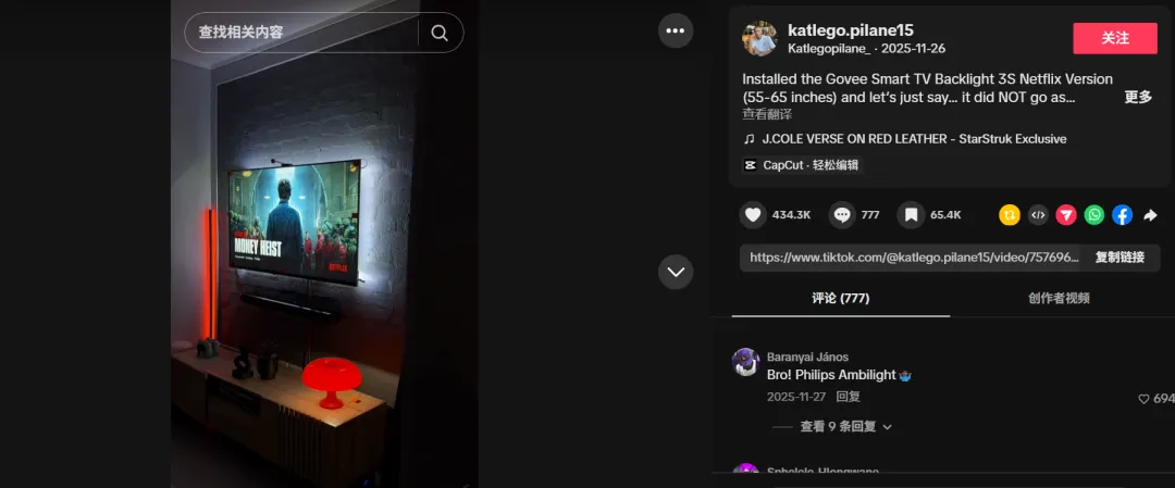 在TikTok上,Govee与Vloger@katlego.pilane15合作,展示了如何用Govee灯带装饰房间,获得了43.3万的点赞,吸引了大量用户的关注。