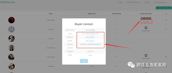 点击 Show Contact并且支付金币后即可查看对应的Reviewer的联系方式。包含邮箱、Facebook账号等信息。已经支付过的Reviewer信息会显示Purchased 状态,直接点击查看或者导出即可。