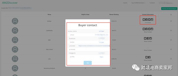 提交URL后,AMZDiscover会开启后台大数据抓取程序,识别买家的身份,获取买家的邮箱、Facebook、Twitter、Instagram等社交信息。