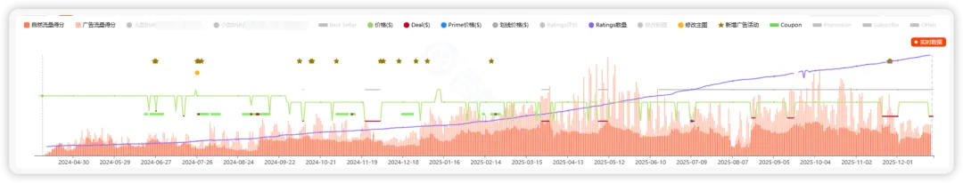 上面我用西柚找词反查了一下上面截图所示中的优秀链接的出单情况,转化为折线图之后,恰恰好也能体现我这个观点:新品推广的单量会存在瓶颈期,大概跟访客一样,要满足10-20-30-50-100-150-200-300-500的日销量的阶段性突破。