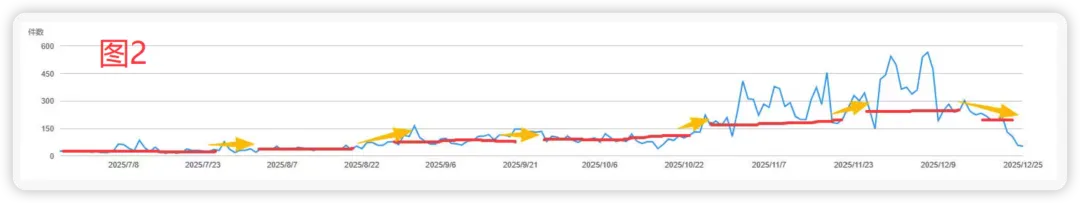 这里没有说一定是这么一些固定的数字,具体的还是要根据你自己的推广阶段目标单量来定,我只是以我现在推广中的为一个参考,图1 是我去年的一个产品的销量情况,图2是我今年推广中的一个产品的销量折线图,为了更好地看出这个趋势,我又用西柚找词反查了一下(图3),红色线标出来是为了更好地看到整个单量的走向:大体上是增长的,呈现一个阶段性递增的过程。