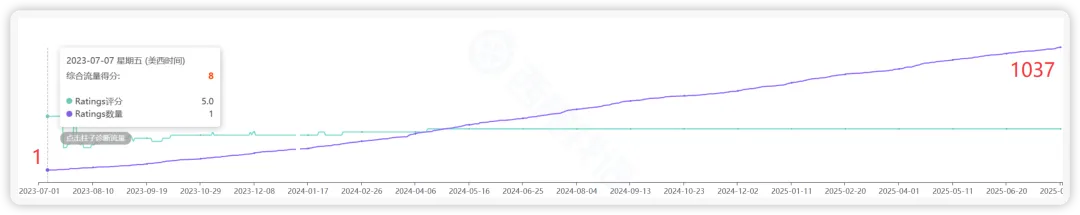 下图是我用西柚找词反查筛选出来的优秀链接的评论走势图,基本上到了500个rating之后,该链接的评分就稳定在4.5颗星了,这个时候就具备一定的抗击打能力。