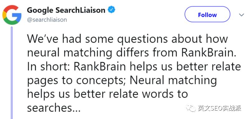 Google回答上周的那次算法更新时表示,它与Penguin更新没有联系,而且不是最大的更新,当被问及是否与去年8月的Medic更新存在关系时,Google发言人的回答似乎也很敷衍(使用官方语言,相当于没说)。谷歌同时表示,此次更新与以前的Neural matching算法没有关联,Neural matching算法是基于AI用来更好的联系关键词与文章内容的手段,相当于一个超级同义词系统(super-synonym system),并且Google称这个算法发已经作为核心算法的重要组成部分长达半年了。