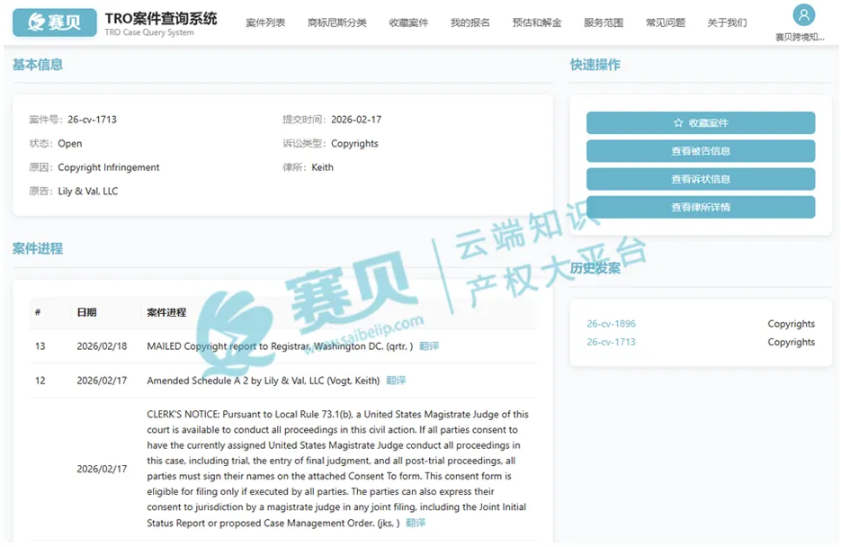 从赛贝TRO案件查询系统获悉,由Keith律所代理原告Lily & Val, LLC发起TRO版权诉讼,核心诉求为制止被告的版权侵权行为,涉案版权是围绕22张食谱插画进行维权,2026年2月17日立案起诉200名跨境电商店铺,19日立案起诉167跨境电商店铺。