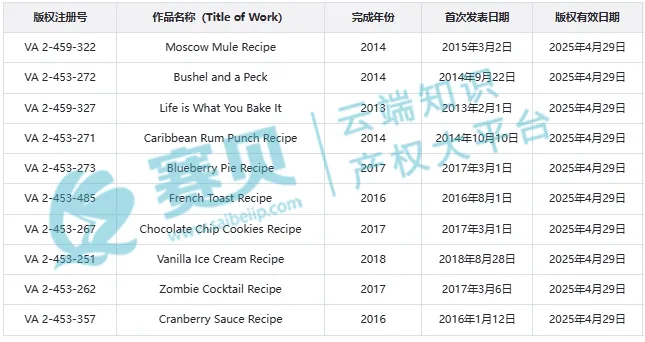 本案版权涉及22张作品,涵盖各类版权保护的食谱插画作品。列举部分版权如下,赛贝提醒跨境卖家,未经授权不得擅自使用,以免引发侵权风险。
