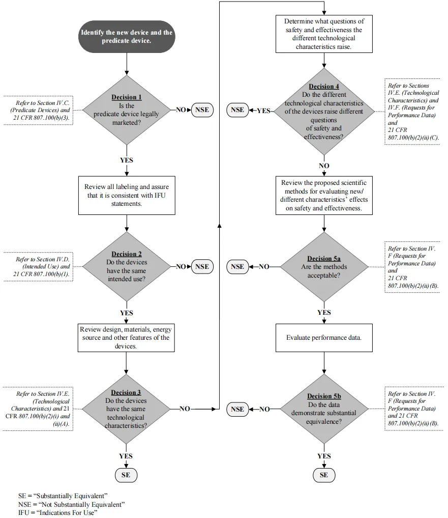 《联邦食品、药品和化妆品法案》第 513(i) 条(Section 513(i) of the FD&C Act)和 21 CFR 807.100(b) 规定,新型器械要被视为与对比器械实质等同 SE(Substantially equivalent),则必须满足以下条件:新型器械必须与对比器械具有相同的预期用途(Intended use)和相同的技术特性(Technological characteristics),或者具有不同的技术特性,但这些特性不会引发与对比器械不同的安全性和有效性问题。