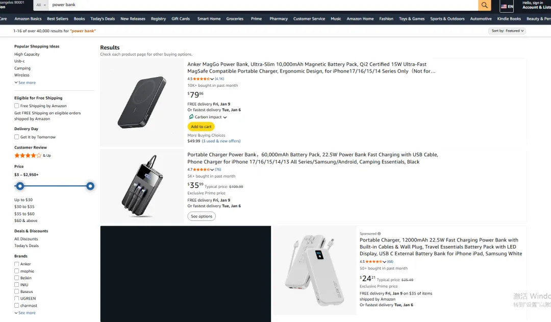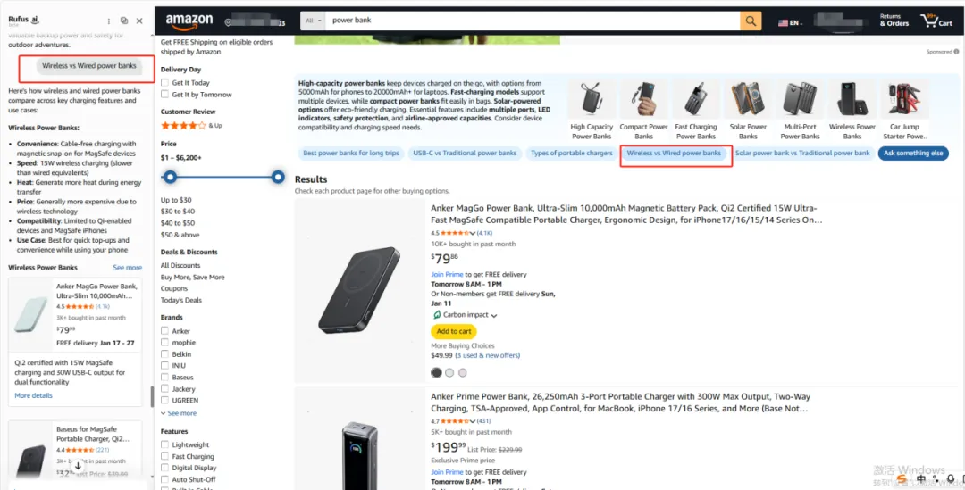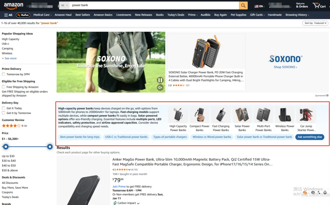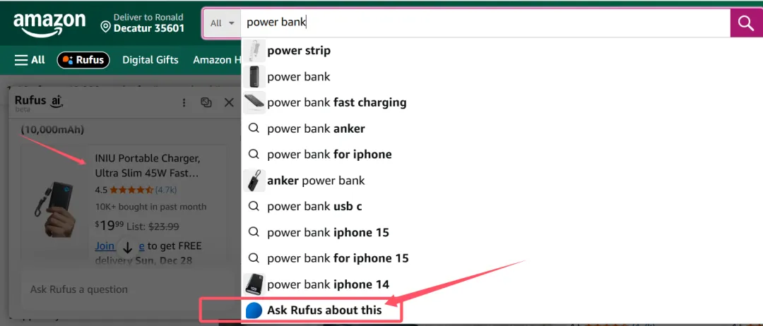 打开亚马逊前台不难发现,如今买家在搜索框输入关键词(如 “power bank”)时,系统不再单纯返回商品列表,而是会同步触发 Rufus 智能推荐。