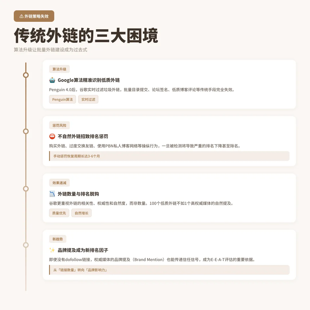 AI 搜索的普及只会加速这个趋势。ChatGPT、Perplexity 这些 AI 工具,更依赖权威来源的引用,而不是传统外链。你现在不转型,等 AI 搜索彻底取代传统搜索,就真的来不及了。