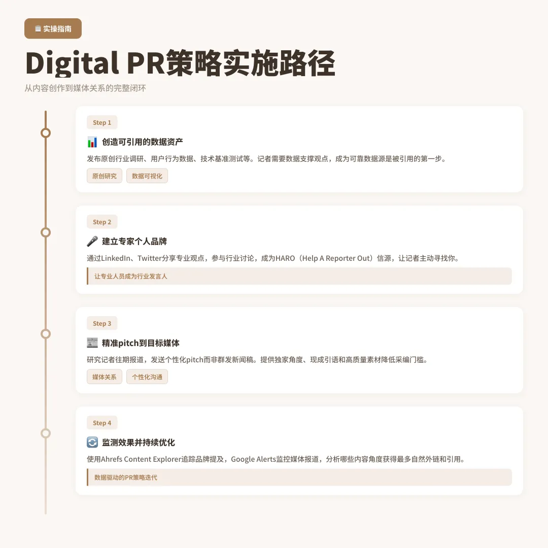 Digital PR 的思路是:产出新闻价值内容 → 主动对接媒体/记者 → 获得报道和引用 → 同时建立品牌声誉和高质量 backlinks。