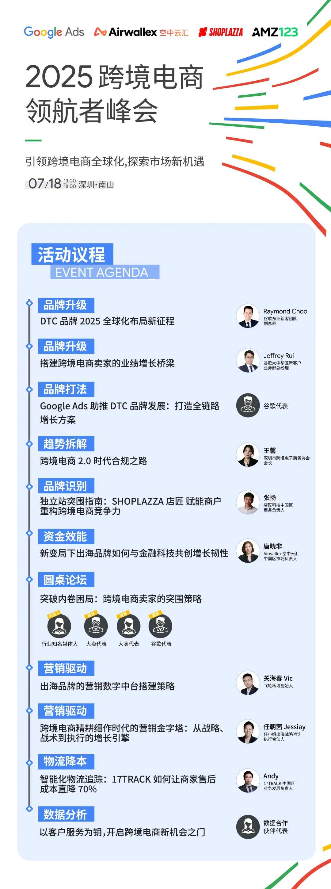 面对这些机遇与挑战,跨境电商卖家需要不断探索新路径,为了帮助跨境电商卖家抓住全球市场的新机遇,AMZ123携手Google Ads、Airwallex空中云汇和SHOPLAZZA将于2025年7月18日在深圳南山联合举办「2025跨境电商领航者峰会」。本次峰会旨在引领跨境电商全球化,探索市场新机遇,为行业从业者提供一个交流和学习的平台。