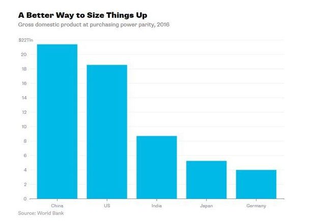 经济学家试图通过一个称为购买力平价(PPP)的调整来纠正这个问题,该调整控制了相对价格。 虽然这并不是完美的,由于它必须考虑产品质量等难以衡量的事情,但是它能更准确的描述一个国家到底能生产多少。而在此,中国已经超过美国。