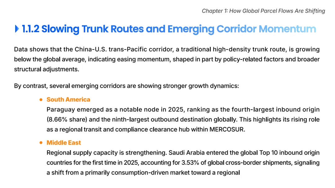 报告显示,中国-美国跨太平洋主干通道货量增速低于全球平均水平,增长动能有所减弱。相较之下,多条新兴贸易通道的增长更为活跃,如南美和中东。这一变化也意味着,跨境物流的竞争焦点正在从单一通道效率,转向更复杂的区域组合、节点协同与风险分散能力。