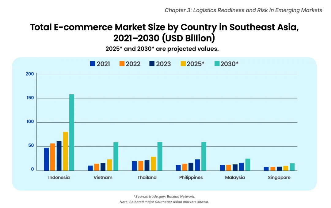 报告指出,东南亚市场电商增长迅速,物流体系正经历从跨境直发向本地化履约的深刻转型。制造业转移与本地消费市场崛起,共同构成了供应链区域化的“双引擎”。这不仅降低了长链物流依赖,也催生了区域内B2B物流和分销网络的新需求。