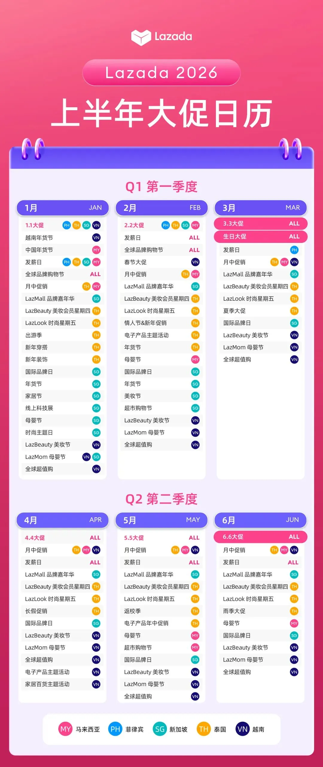 我们还为大家准备了2026年Lazada上半年五国大促日历详细版,希望帮助商家朋友们抓住营销时机,踩准大促时间节奏,抢先制定增长策略。2026,继续爆单!