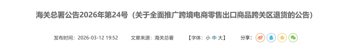 3月12日,我国海关总署发布2026年第24号公告,宣布4月1日起在全国正式推广跨境电商零售出口(9610 模式)商品跨关区退货政策,彻底打破了传统退货的关区限制。